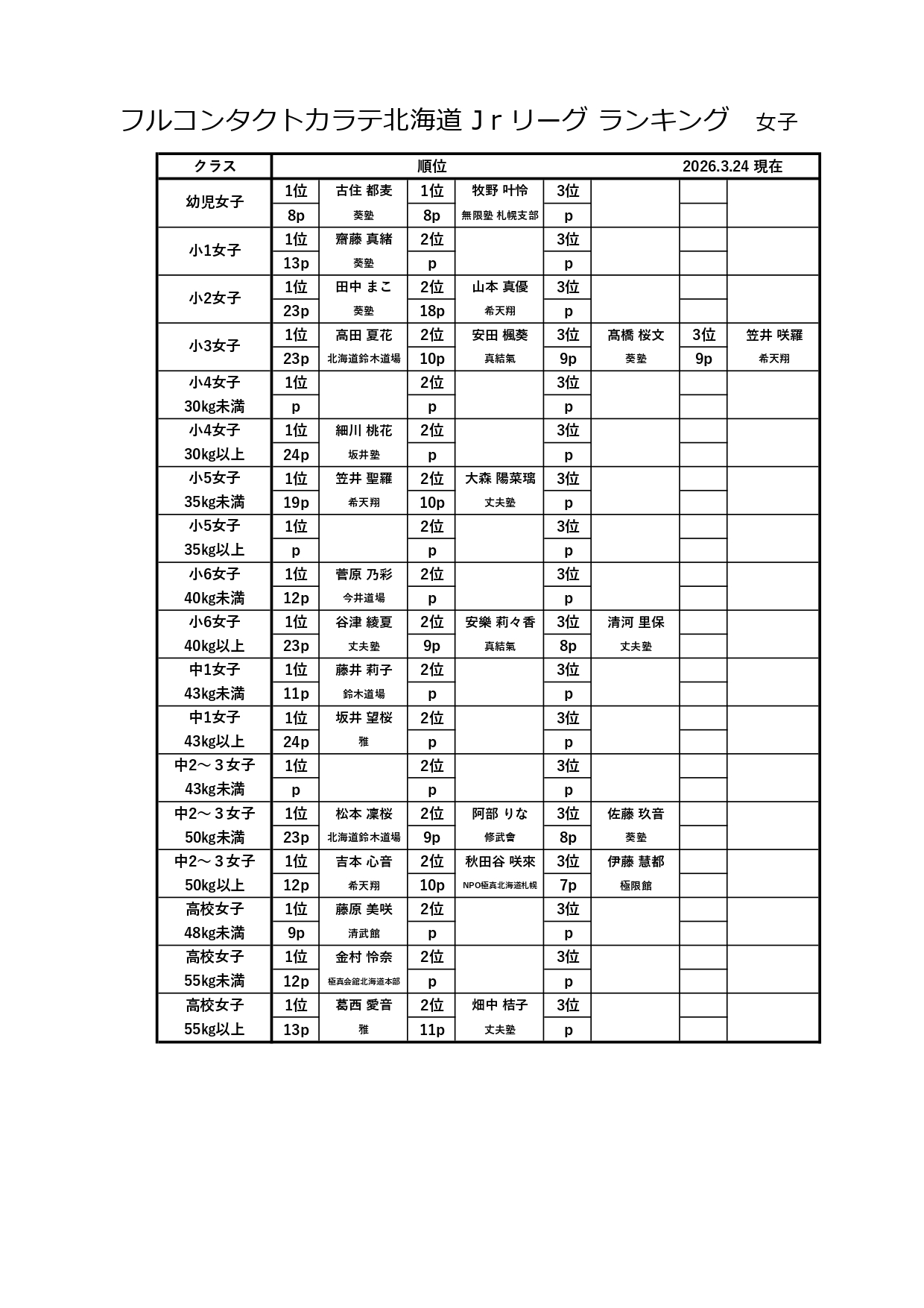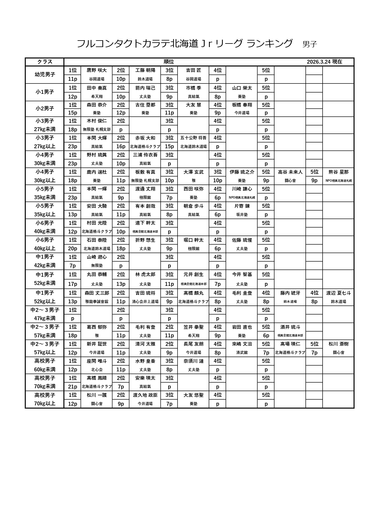 ・北海道ランキングは上級クラスのみといたします。(上級・初級の分けない階級は上級とカウントします。 中上級は上級カウント・初中級は初級カウントとします)